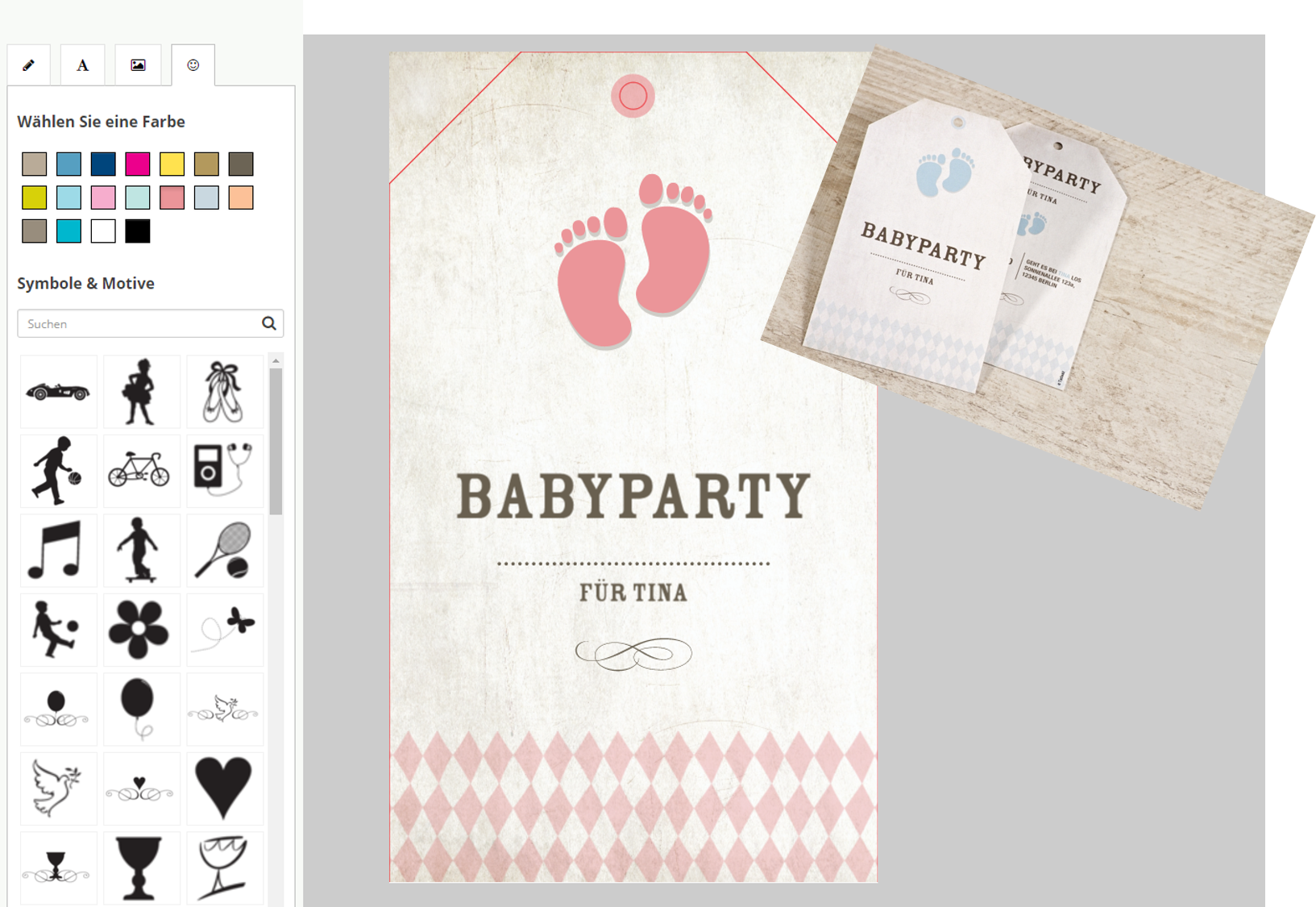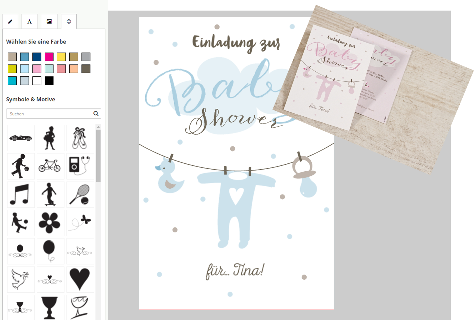 All unsere Einladungskarten zur Baby Shower oder Baby Party, sind farblich für Jungen und Mädchen anpassbar.