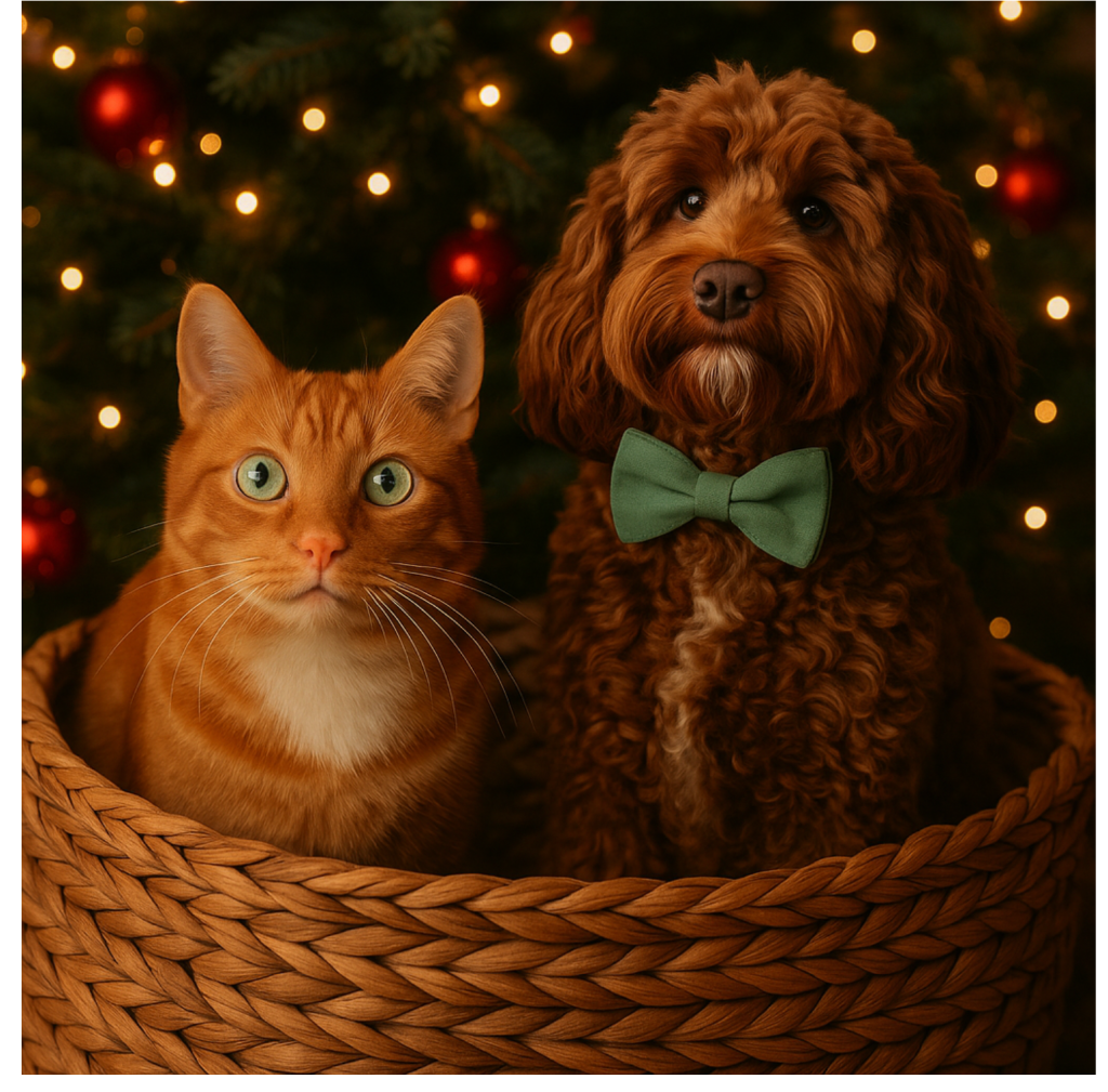 „Setze meinen Hund und meine Katze gemeinsam in eine stimmungsvolle weihnachtliche Szene.“