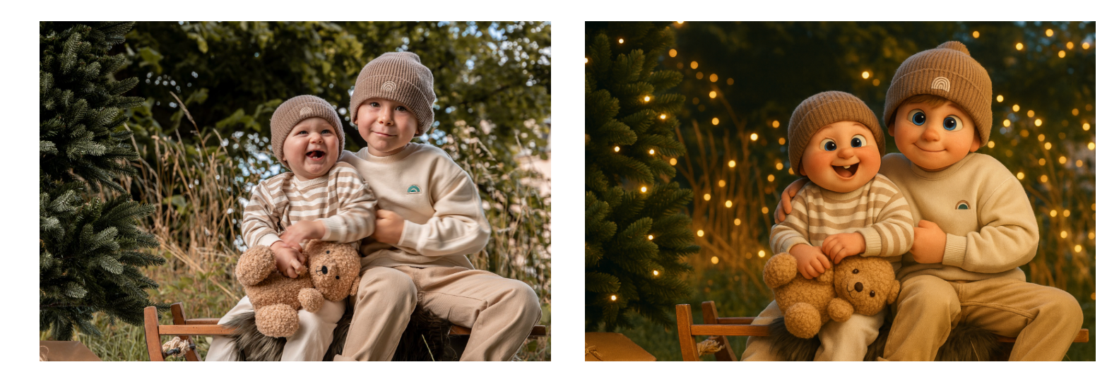 „Bewerte dieses Foto und verwandle die Hintergrundszene in eine festliche Weihnachtskulisse. Die Personen sollen unverändert bleiben und sich natürlich in die neue Umgebung einfügen. Passe das Licht an die warme, gemütliche Atmosphäre an. Die Farben der Weihnachtsdeko sollen sich an der Kleidung der Personen orientieren, damit ein harmonisches Gesamtbild entsteht.“
